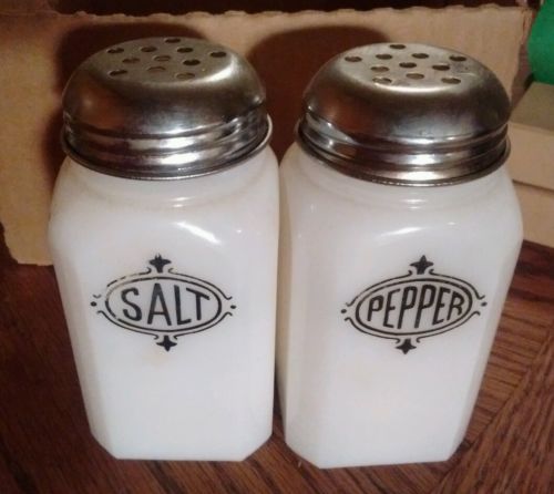 Title (ebay affiliate link): Vintage Pair White Milk Glass Salt & Pepper Shakers Black Label , Hazel Atlas