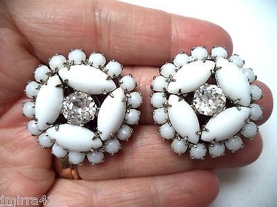STUNNING VINTAGE SIGNED WEISS MILK GLASS RHINESTONE FLOWER CLIP EARRINGS!!! 386N