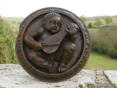 SUPERB 19thc OAK WOOD CARVING OF CHERUB WITH STRINGED INSTRUMENT