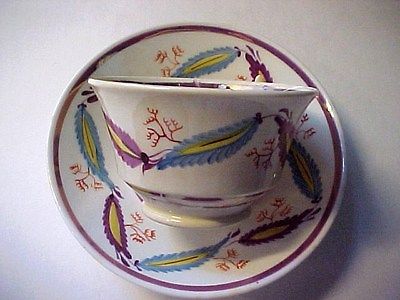 Title (ebay affiliate link): Antique Pink Luster Cup and Saucer with Hand Painted Feather Design c 1840