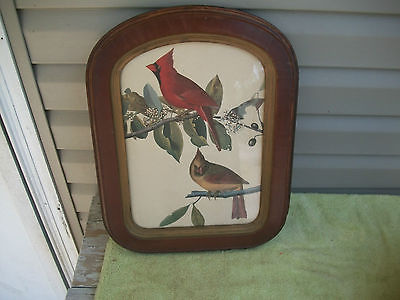 ANTIQUE 18X14 INCH WOODEN SEMI-OVAL PICTURE FRAME WITH CARDINALS BIRD PRINT