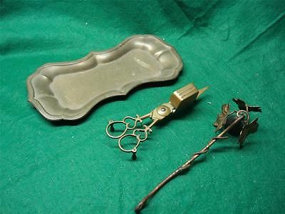 ANTIQUE EARLY BRASS CANDLE WICK TRIMMER WITH SNUFFER SCISSORS & TRAY ENGLAND