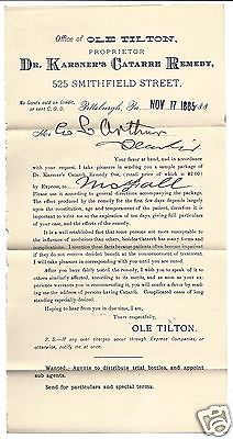 Title (ebay affiliate link): OLE TILTON Signed Receipt Nov 17 1885 DR KARSNER'S CATARRH REMEDY Pittsburgh Pa