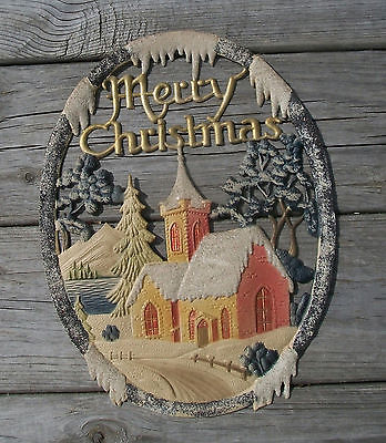 Vintage Merry Christmas Diecut Embossed Church Scene Wall Hanger Mica W Germany