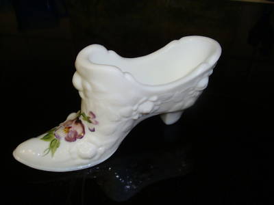 FENTON MILK GLASS FLORAL SHOE/SLIPPER "PANSIES" Signed