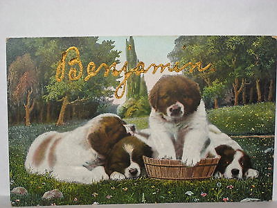 1910 POSTCARD 4 BIG PUPPY DOGS WITH WOOD BUCKET - BENJAMIN
