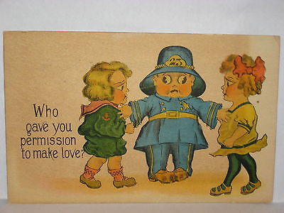 1914 POSTCARD POLICE WITH YOUNG COUPLE-WHO GAVE YOU PERMISSION TO MAKE LOVE?