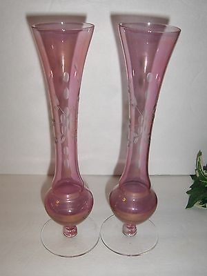 2 Vintage Pink Etched Depression Glass Bud Vase Clear Round Pedestal Base 9 3/4"
