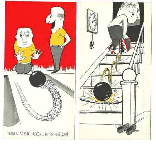Title (ebay affiliate link): 4 Large Funny Unused Bowling Postcards - 1960's Cartoon Graphics - Humorous