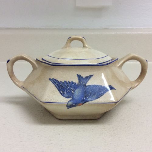 Vintage Blue Bird Pattern Ceramic Sugar Bowl w Lid