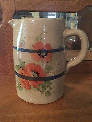 Vintage Blue Stripe Crock Pitcher with Hand Painted Poppies
