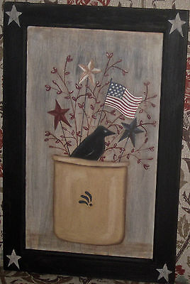 *~*PRIMITIVE*~* HP FOLK ART PRIM CROCK*~*CROW*~*FLAG*~*AMERICANA *~* DOOR PANEL