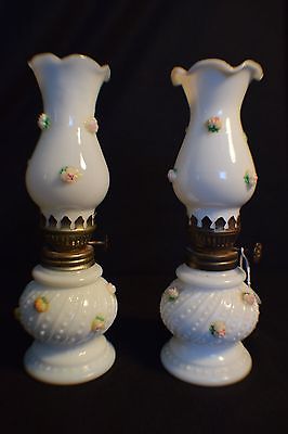 Two Vintage Miniature Oil Lamps White Milk Glass with flowers