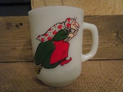 Title (ebay affiliate link): Norwegian Kitchen Witch Coffee Cup Mug Milk Glass Vintage Anchor Hocking