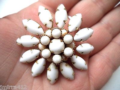 Title (ebay affiliate link): GORGEOUS VINTAGE ESTATE GOLD TONE WHITE MILK GLASS CAB FLOWER BROOCH!!! 1281R