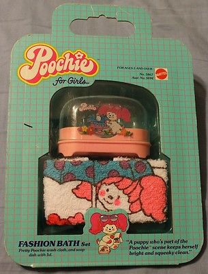 Title (ebay affiliate link): Poochie Fashion Bath Set containing wash cloth, soap dish and lid unopened 1982