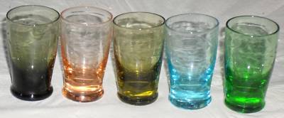 Title (ebay affiliate link): 5 DEPRESSION SHOT GLASS ETCHED BLUE PINK OLIVE TAGSALE