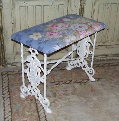 Title (ebay affiliate link): CottageChic WHITE CAST IRON Barkcloth Era COVERED BENCH