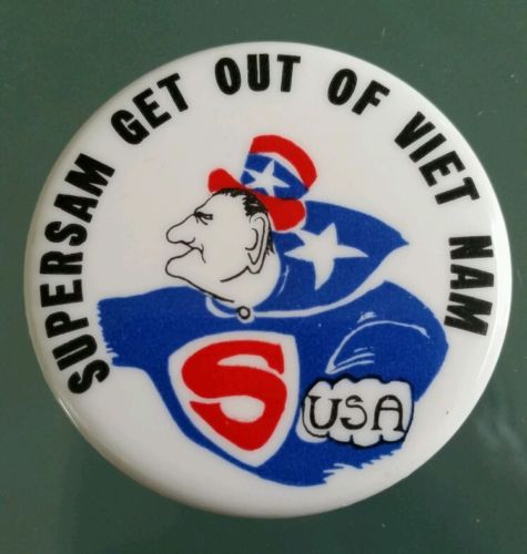 Title (ebay affiliate link): "Supersam Get Out Of Vietnam" Anti War Peace Hippie LBJ Pinback Uncle Sam USA NR