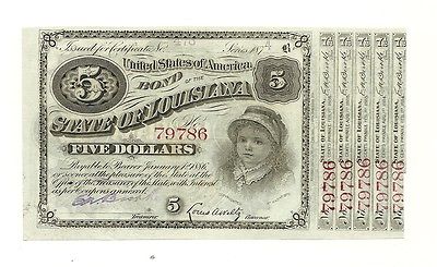 Title (ebay affiliate link): Post-Civil War $5.00 State of Louisiana "BABY BOND" 1870s