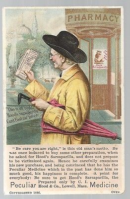 Title (ebay affiliate link): VICTORIAN TRADE CARD Hood's Sarsapirillo Pharmacy LOWELL MA Barnum Circus Text