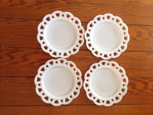 Title (ebay affiliate link): VINTAGE WHITE MILK GLASS PLATES 4 Reticulated Pierced Border Open Lace Edge