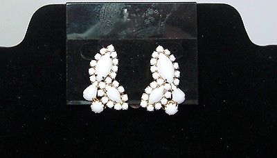 Vintage Juliana Style White Milk Glass, Gold Tone Clip Earrings Prong Set Stones