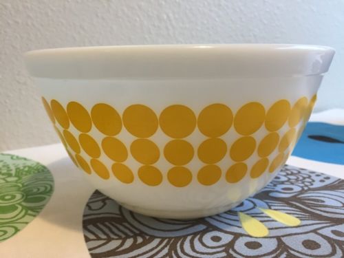 Title (ebay affiliate link): Vintage Pyrex Yellow Polka Dot Milk Glass Mixing Bowl Medium 1.5 Quart 402