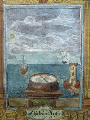 1680 c NAVIGATION LIGHTHOUSE COMPASS FINE EMBLEMATIC by Arndt original engraving