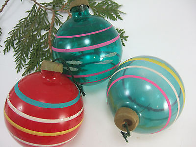3 Large Vintage WWII Stripe Glass Christmas Ornament Paper Cap