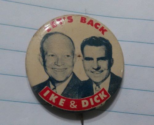 Title (ebay affiliate link): LET'S BACK IKE AND DICK, EISENHOWER AND NIXON 1956 JUGATE POLITICAL CAMPAIGN PIN