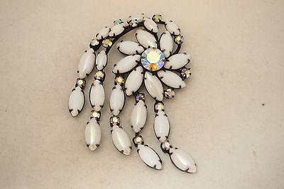 Vintage REGENCY? Huge Dangle Milkglass AB Floral Flower Navette Brooch Pin WOW!!