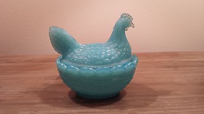 Cute little vintage blue milk glass hen on nest lidded bowl
