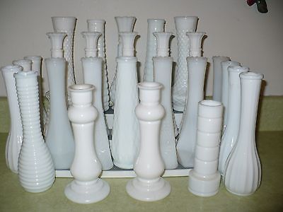 Title (ebay affiliate link): Large lot 26 White Assorted Milk Glass Bud Vases Vintage Wedding Shower Florist