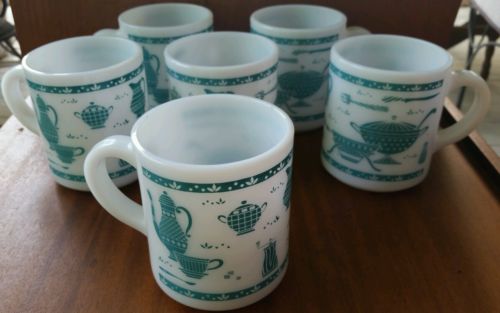 Title (ebay affiliate link): 6 VINTAGE HAZEL ATLAS MILK GLASS AQUA BLUE PRINT COFFEE MUGS CUPS