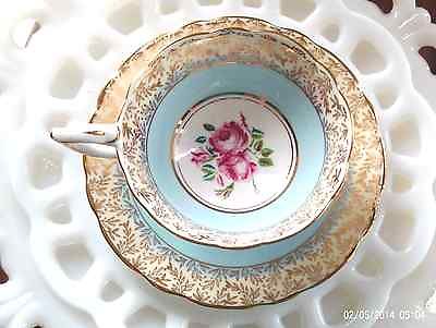 VTG ROYAL STAFFORD TEA CUP SAUCER AQUA ROSE GOLD GILT RIBBED RIM 40s BIN $24.99