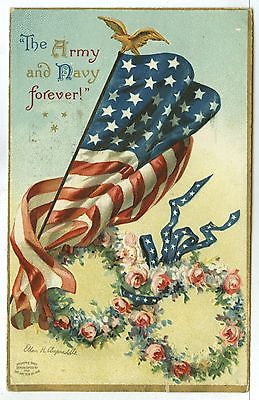 Signed & Embossed Ellen Clapsaddle, "The Army and Navy forever", Flag and Wreath