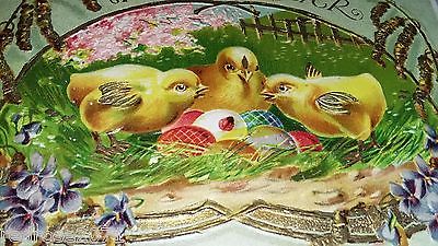 VINTAGE old HOLIDAY EASTER postcard CUTE BABY CHICKS violets GOLD TRIMMED