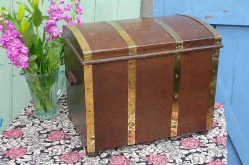 Vintage Dome Top Chest Trunk Brass Straps Log Storage Box, Toy Box, Rustic Chic