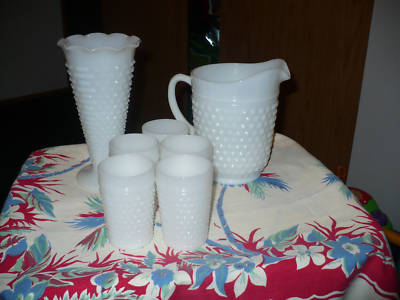 Vintage Milk Glass Lot Hobnail Pitcher, Vase, Glasses