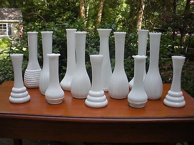 Title (ebay affiliate link): Lot of 13 White Milk Glass Bud Vases Vintage Wedding Shower Florist 6" & 9"