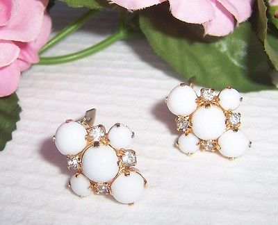 Title (ebay affiliate link): VINTAGE MILK GLASS & RHINESTONE CLIP ON EARRINGS GOLD COLOR RHODIUM SETTING