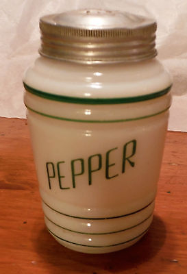 RARE VINTAGE RIBBED WHITE MILK GLASS GREEN STRIPES PEPPER SHAKER