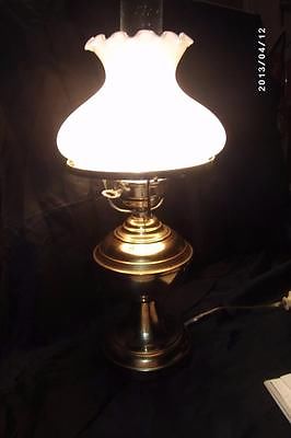 Title (ebay affiliate link): VINTAGE BRASS HURRICANE ELECTRIC TABLE LAMP W/WHITE MILK GLASS GLOBE SHADE