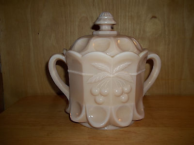 Pink milk glass canister, 7" tall, 7" wide including handles, no chips