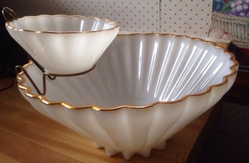 Title (ebay affiliate link): Vintage 50-60's Solid White Milk Glass Clam Shell-Sunburst Base Chip & Dip Bowl