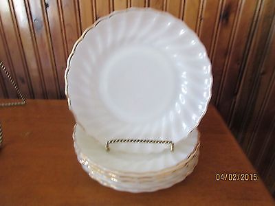 6 ANCHOR HOCKING FIRE KING SALAD PLATES MILK GLASS GOLD TRIM SWIRL DESIGN BOWLS