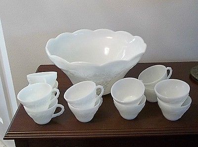 Title (ebay affiliate link): Vintage White Milk Glass Punch Bowl and 12 Cups Grape Design