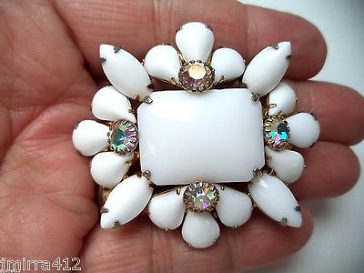 UNIQUE VINTAGE GOLD TONE HIGH END MILK GLASS AB RHINESTONE FLOWER BROOCH!! 2081W