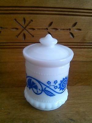Vintage Milk Glass Spice Condiment Jar Blue White Floral with Lid
